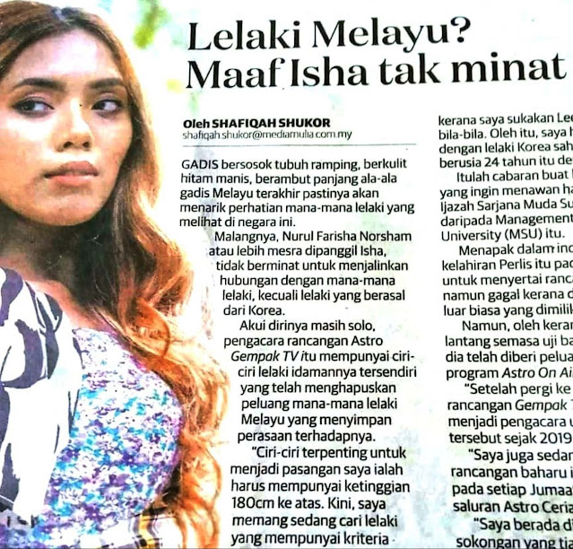 Apa yang menjadi bualan ramai gadis berkulit hitam manis itu tidak berminat untuk menjalinkan hubungan cinta dengan lelaki Melayu dan lebih memilih lelaki berasal dari Korea.
