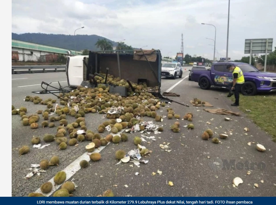"Muatan durian yang dibawa bertaburan di lebuh raya," katanya dalam kenyataan di sini, hari ini.