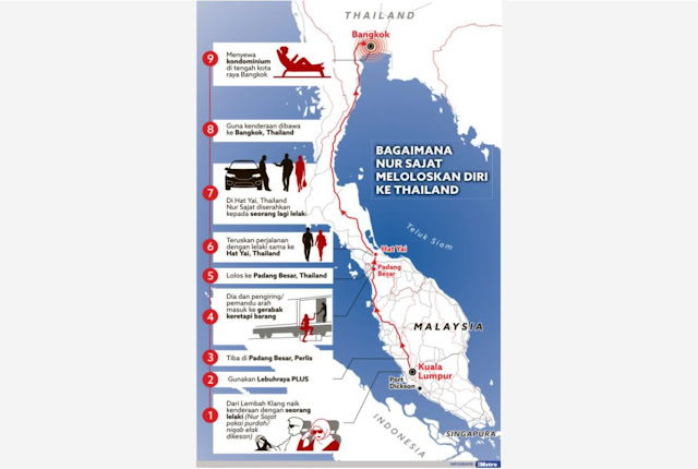 "Nur Sajat yang ketika itu sedang bersembunyi di Lembah Klang mula mencari jalan untuk keluar ke negara ini. Dia kemudiannya diperkenalkan kepada seorang lelaki yang mahir dengan selok-belok di kawasan sempadan sebelum bersetuju membayar RM20,000 sehingga selamat tiba di Bangkok.